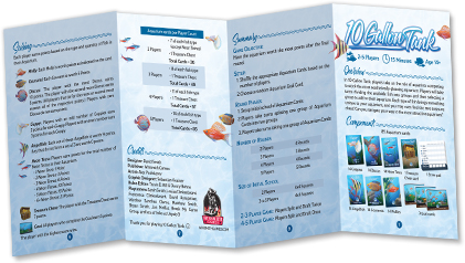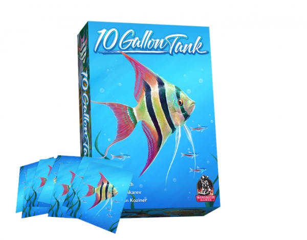 In 10 Gallon Tank, players take on the role of aquarists competing to stock the most aesthetically pleasing aquarium. Players will take turns dividing large schools of fish into increasingly smaller groups of fish, then selecting groups to add to their aquarium. Each type of fish brings something unique to your aquarium.